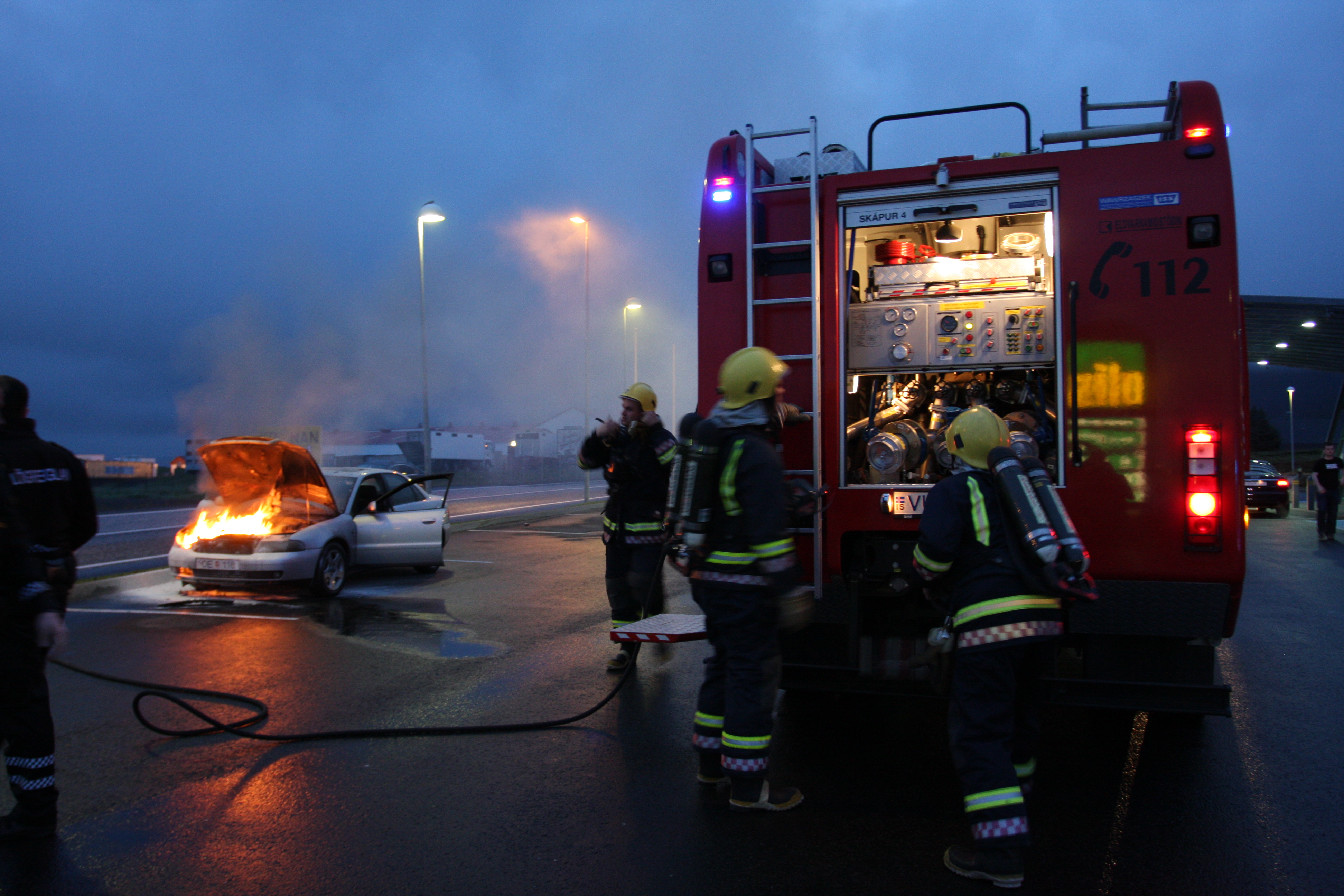Lögreglumenn sem voru fyrstir á vettvang beittu handslökkvitækjum á eldinn en það dugði ekki til. Töluverður eldur var undir vélarhlíf bílsins þegar slökkviliðið kom á vettvang en slökkvistarf gekk hratt fyrir sig. Bifreiðin er töluvert skemmd.