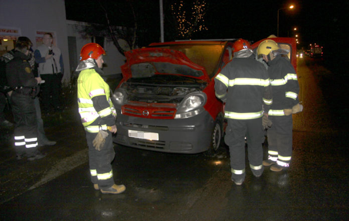 Þegar slökkviliðið kom á staðinn var þó aðeins um glóð og neistaflug að ræða en eldur hafði kviknað í alternator bílsins.