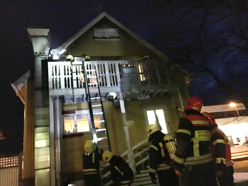 Snarráðir gestir fóru út á svalir við reykháfinn og slökktu eldinn með slökkvitækjum.