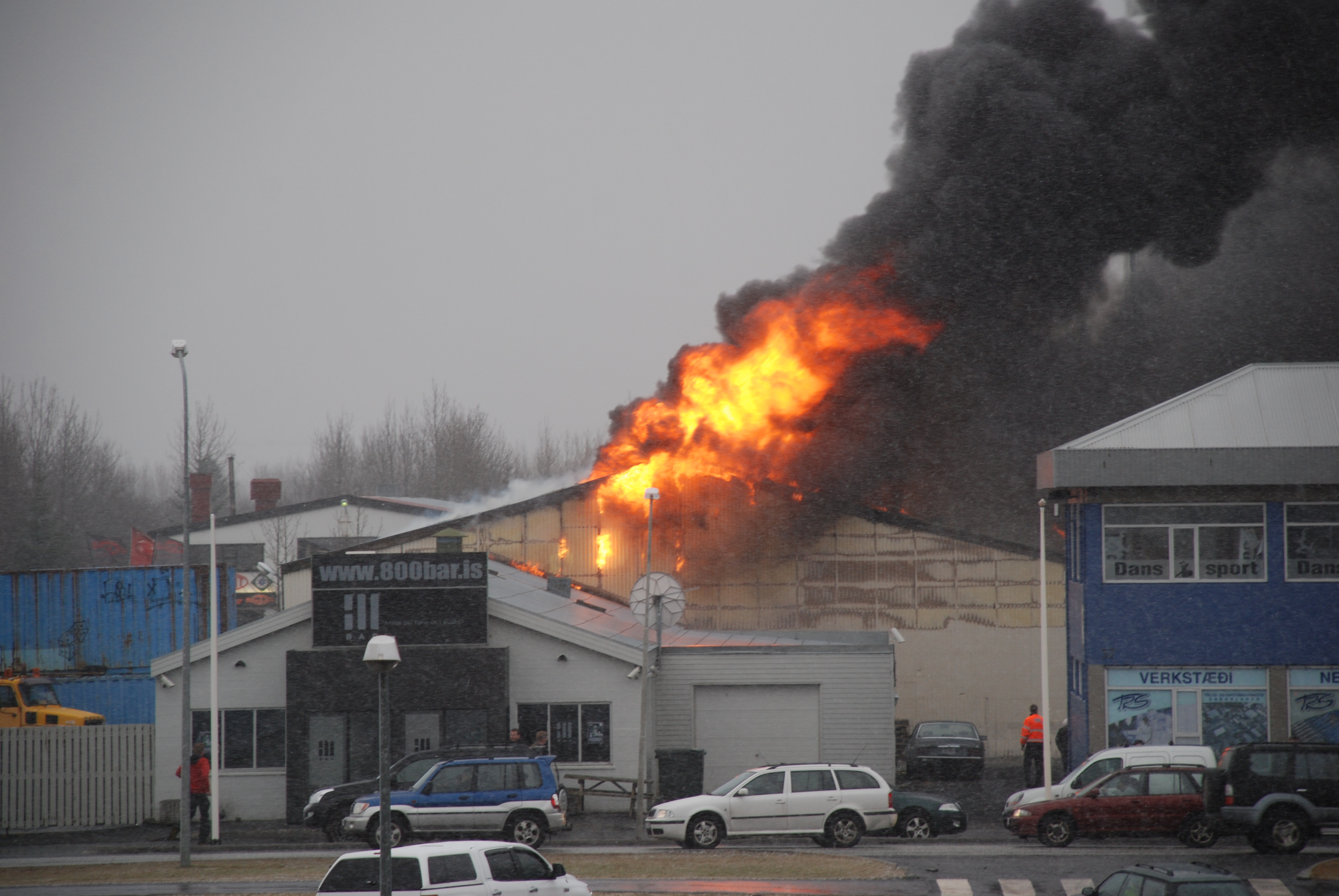 Mikill eldur er í húsinu og leggur slökkviliðið mesta áherslu á að bjarga nærliggjandi húsum.
