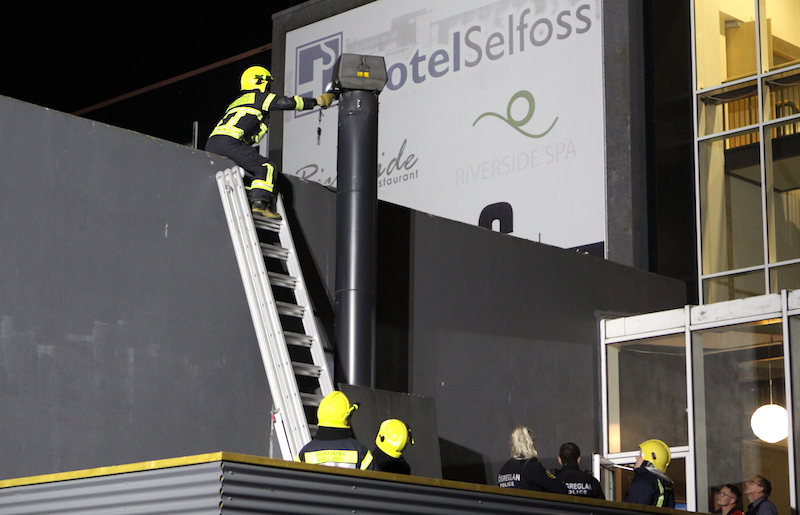 „Starfsmenn hótelsins skutu með duftslökkvitæki inn í rörið og hitinn dregur duftið með sér upp í gegnum rörið þannig að það hefur vonandi slokknað alveg. Við erum núna að fullvissa okkur um að hitinn í rörinu sé ekki að aukast, hann sé jafn eða á leiðinni niður og ekki búinn að dreifa úr sér,“ bætti Haukur við en skorsteinninn var myndaður af slökkviliðinu með hitamyndavél.