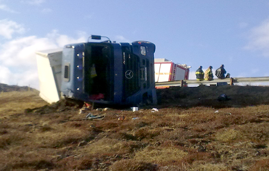 Ökumaðurinn slapp án meiðsla og getur þakkað það bílbeltunum að sögn lögreglu. Bifreiðin er óökufær en slysið er rakið til þess að farmurinn hafi losnað inni í bílnum og kastað honum til í neðstu beygjunni í Kömbunum.