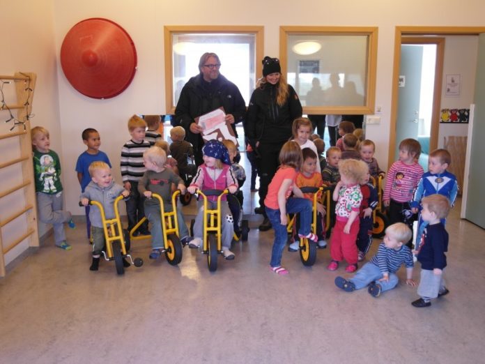 Fulltrúar frá SagaFilm komu í heimsókn í leikskólann Brimver á Eyrarbakka í morgun og færðu leikskólanum fimm Rabo hjól að gjöf.