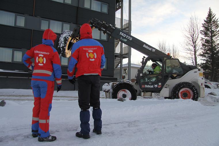 Brugðið var á það ráð að lyfta vörubíladekkjum upp á þakið og þau voru notuð til þess að fergja dúkinn. Fimm björgunarsveitarmenn sinna útkallinu auk starfsmanna Ræktunarsambands Flóa og Skeiða.