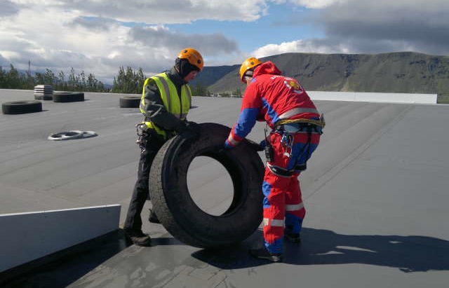 Björgunarsveitarmennirnir nota krana til þess að hífa bíldekk upp á þak hússins og dreifa þeim um þakið til að hefta fok þakklæðningarinnar.