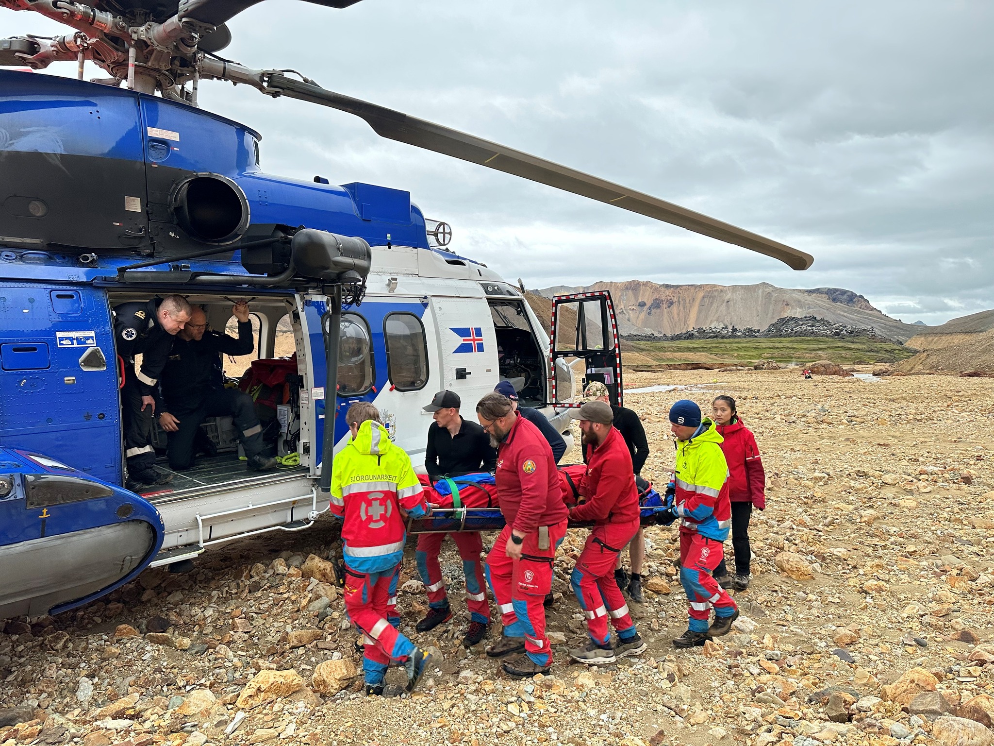 Á sunnudag var þyrlusveitin aftur kölluð út að sama slóða við Bláhnjúk vegna göngumanns sem hafði runnið niður skriðu og slasast. Þyrlan lenti á sama stað og degi áður, sótti göngumanninn og flutti á Landspítalann í Fossvogi.