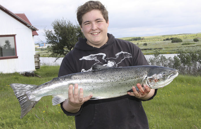 Róbert slapp vel því laxinn var örmerktur og því búið að klippa af honum veiðiuggan. Ekki kom því til þess að Róbert þyrfti að bíta uggann af.