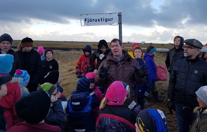 Kjartan Björnsson, formaður íþrótta- og menningarnefndar og Magnús J. Magnússon, skólastjóri BES ávörpuðu hópinn áður en elsti og yngsti nemandi skólans afhjúpuðu nafnið á stígnum. Yngsti nemandi skólans er Kristrún Birta Guðmundsdóttir en sá elsti heitir Smyrill Valsson og leystu þau verkefnið vel af hendi.
