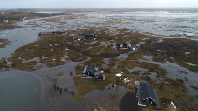 Mikið rennsli mælist enn í Hvítá en búist er við því að það minnki í lok dags. Enn eru ísstíflur í Hvítá á Suðurlandi og flæðir yfir árbakka að orlofshúsum í Vaðnesi.