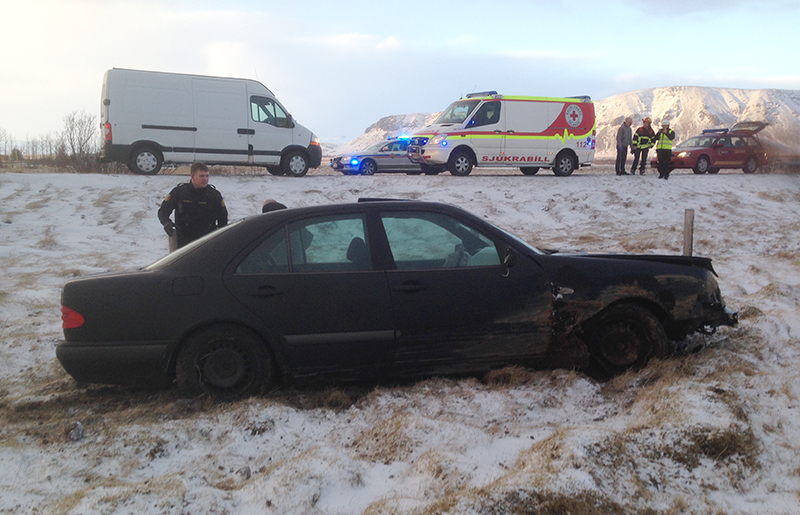 Lögregla og sjúkralið voru kölluð út ásamt tækjabíl frá Brunavörnum Árnessýslu þar sem óttast var að ökumaðurinn væri fastur í bílnum. Hann komst þó að lokum út af sjálfsdáðum og var fluttur til skoðunar á slysadeild Heilbrigðisstofnunar Suðurlands á Selfossi. Ökumaðurinn var einn í bílnum og eru meiðsli hans ekki talin alvarleg.