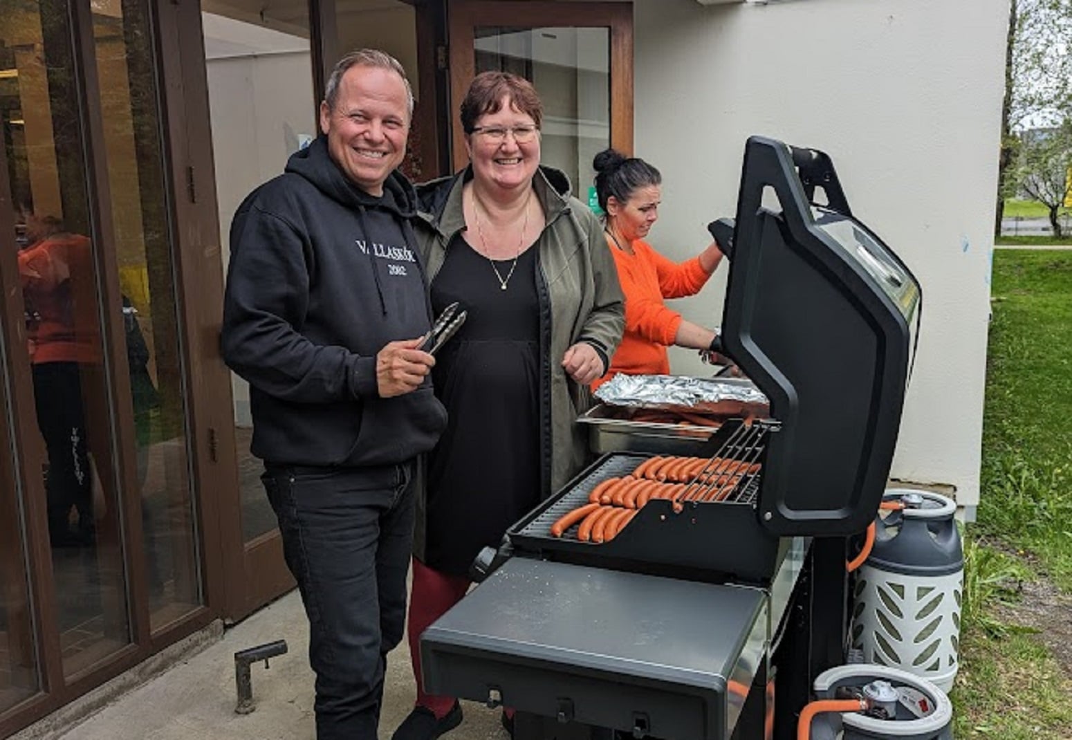 Á myndinni má sjá Pál Sveinsson, skólastjóra Vallaskóla, ásamt Maríu Ágústsdóttir, kennara og gjaldkera foreldrafélagins, spreyta sig á grillmennskunni ásamt Ósk Sveinsdóttur, stuðningsfulltrúa.
