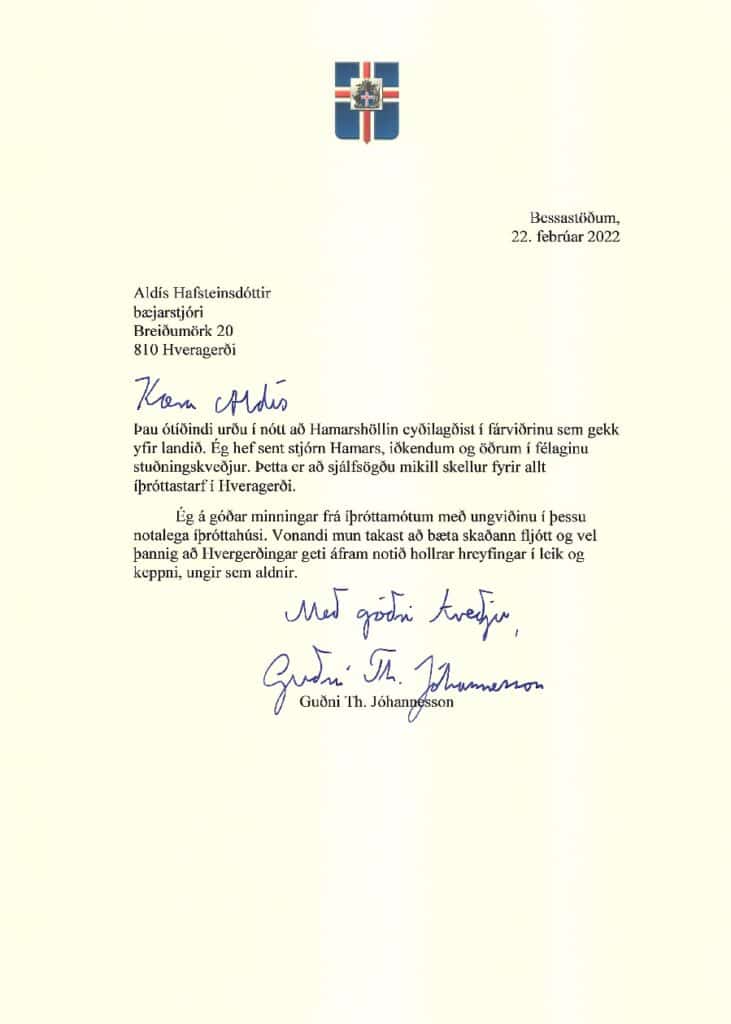 Einn af þeim sem sendi Hvergerðingum kveðju er Guðni Th. Jóhannesson, forseti Íslands. Kveðja Guðna er svohljóðandi: