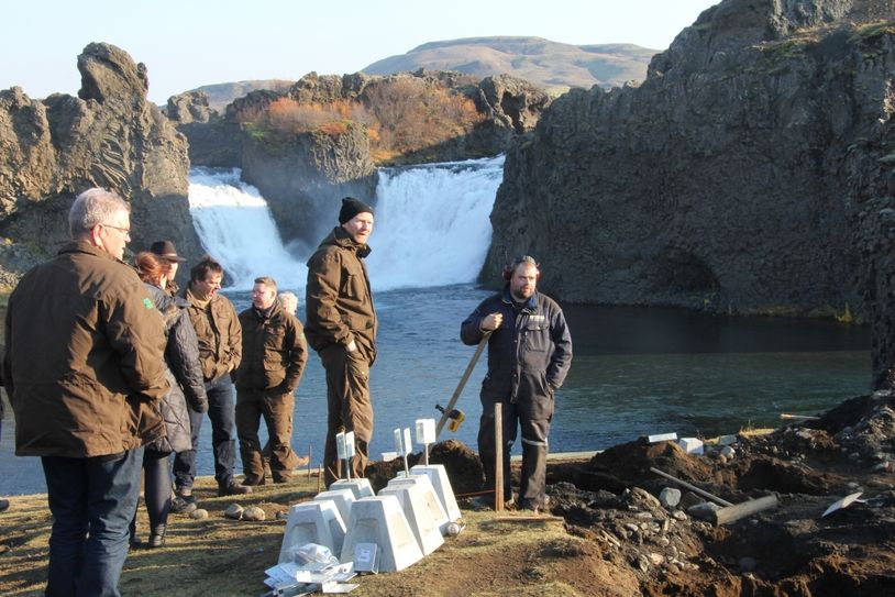 Framkvæmdir ganga vel við Hjálparfoss í Þjórsárdal þar sem í smíðum eru tröppur og pallar fyrir gesti sem koma til að skoða fossinn og umhverfi hans.