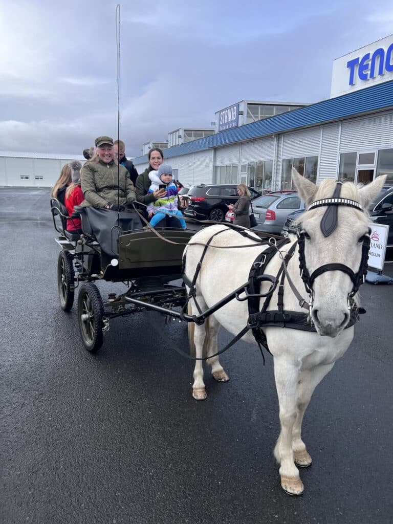 Enginn þurfti að fara svangur heim, enda gestum boðið upp á grillaðar pylsur, flatkökur, kleinur og tertu í tilefni dagsins. Yngri kynslóðinni leiddist heldur ekki að taka rúnt í hestvagninum.