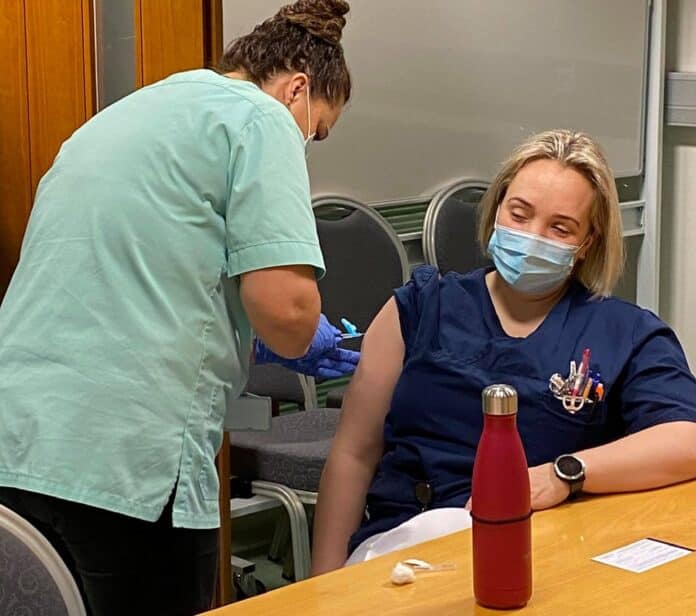 Fyrsta COVID-19 bólusetningin á Heilbrigðisstofnun Suðurlands var framkvæmd í morgun þegar fyrstu heilbrigðisstarfsmennirnir voru bólusettir.