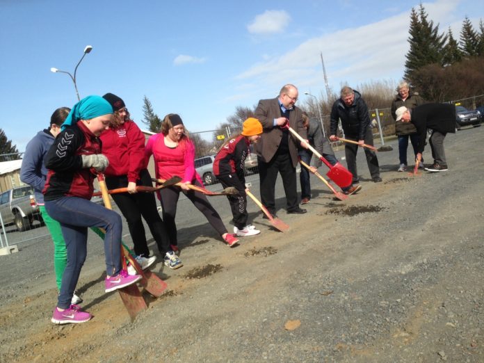 Gunnar Egilsson, formaður framkvæmda- og veitustjórnar Árborgar, Eyþór Arnalds, formaður bæjarráðs, fulltrúar morgunsundhópsins Húnanna og börn frá Selfossi tóku fyrstu skóflustunguna.