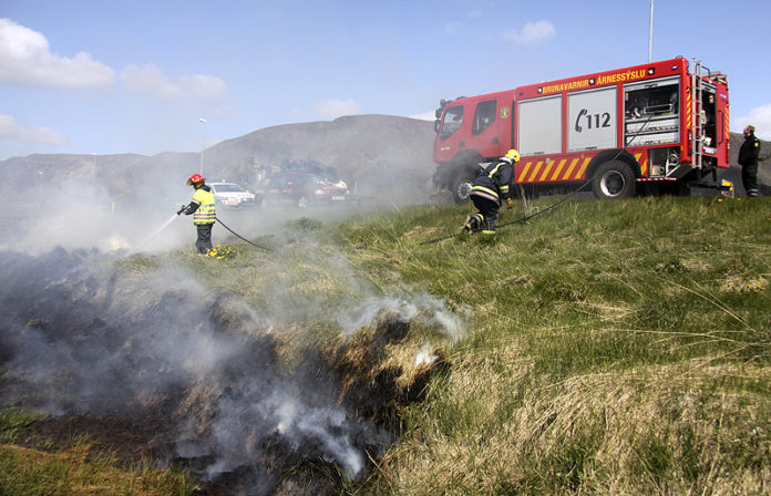 Þetta er fyrsta útkallið á þessu vori vegna sinubruna hjá Brunavörnum Árnessýslu og er óhætt að segja að það sé frekar seint á ferðinni.