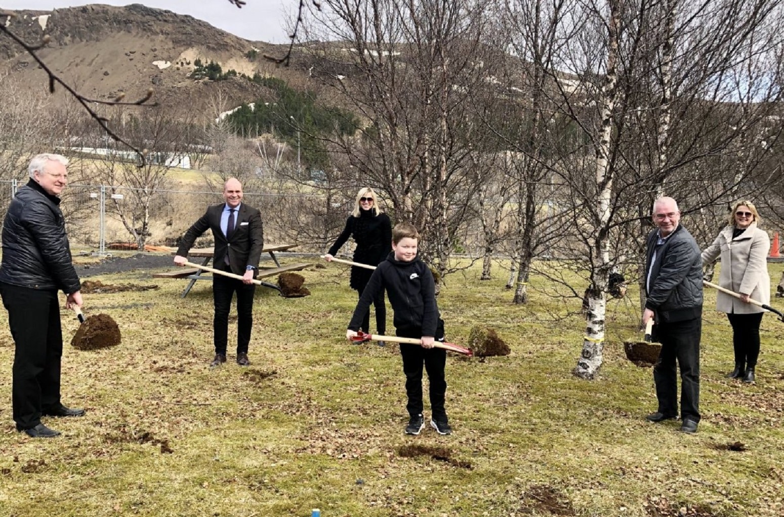Fyrstu skóflustungur að nýrri viðbyggingu við Grunnskólann í Hveragerði voru teknar síðasta vetrardag – með góðu millibili vegna tveggja metra reglunnar.