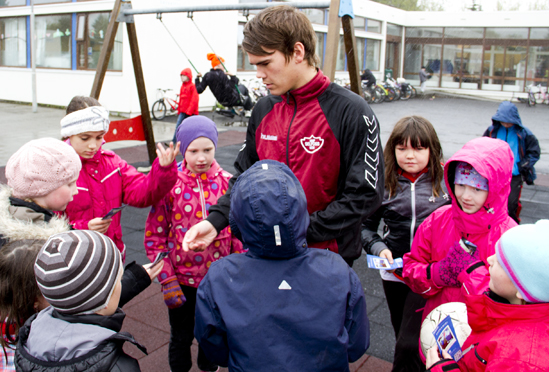 Strákarnir í Pepsi-deildarliði Selfoss í knattspyrnu mættu í grunnskóla á Selfossi í morgunn og gáfu nemendum miða á leikinn í kvöld gegn Grindavík.
