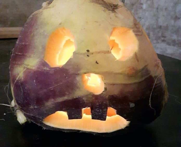Birna Viðarsdóttir, gulrófnabóndi á Norður-Hvoli í Mýrdal, ákvað að skera út rófu með sama hætti og fólk hefur verið að skera út grasker.