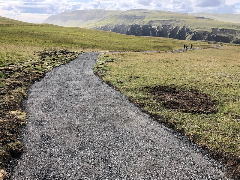 Göngustígurinn er uppbyggður malarstígur, að jafnaði 1,6 metrar á breidd. Geogrid er notað á blautustu köflunum, þunnt plastnet, sem sett er undir mölina til að koma í veg fyrir að mold og möl blandist saman og að stígurinn sígi þannig að hann fljóti í raun ofan á votlendinu. Framkvæmdin er samvinnuverkefni Umhverfisstofnunar, landeigenda og sveitarfélagsins. Megintilgangurinn er að draga úr álagi á náttúru svæðisins með stýrðri umferð og bæta um leið aðgengi fyrir hreyfihamlaða. Göngustígurinn hefur verið opnaður og er hægt að ganga frá útskoti við Lakaveg.