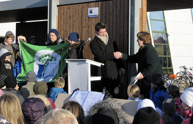 Orri Páll Jóhannsson, frá Landvernd, afhenti síðan skólanum fánann og viðurkenningarskjal en að því loknu drógu fulltrúar nemenda í umhverfisnefnd skólans fánann að húni ásamt Jóni Stefánssyni, umsjónarmanni verkefnisins í Hvolsskóla.