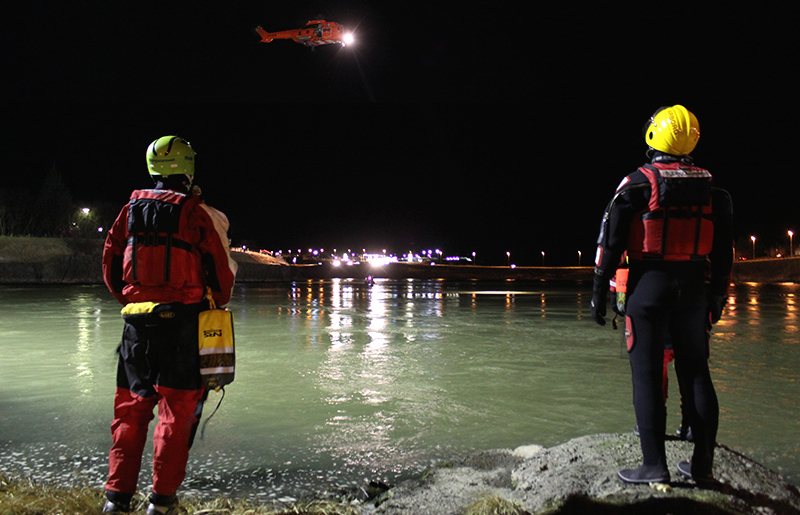 Þyrla Landhelgisgæslunnar mætti á svæðið uppúr miðnætti en hún notar hitamyndavél til leitarinnar. „Þyrlan sér allt hérna á bökkunum og vatnsfletinum en ekki ofan í vatnið, það er of kalt til þess.“