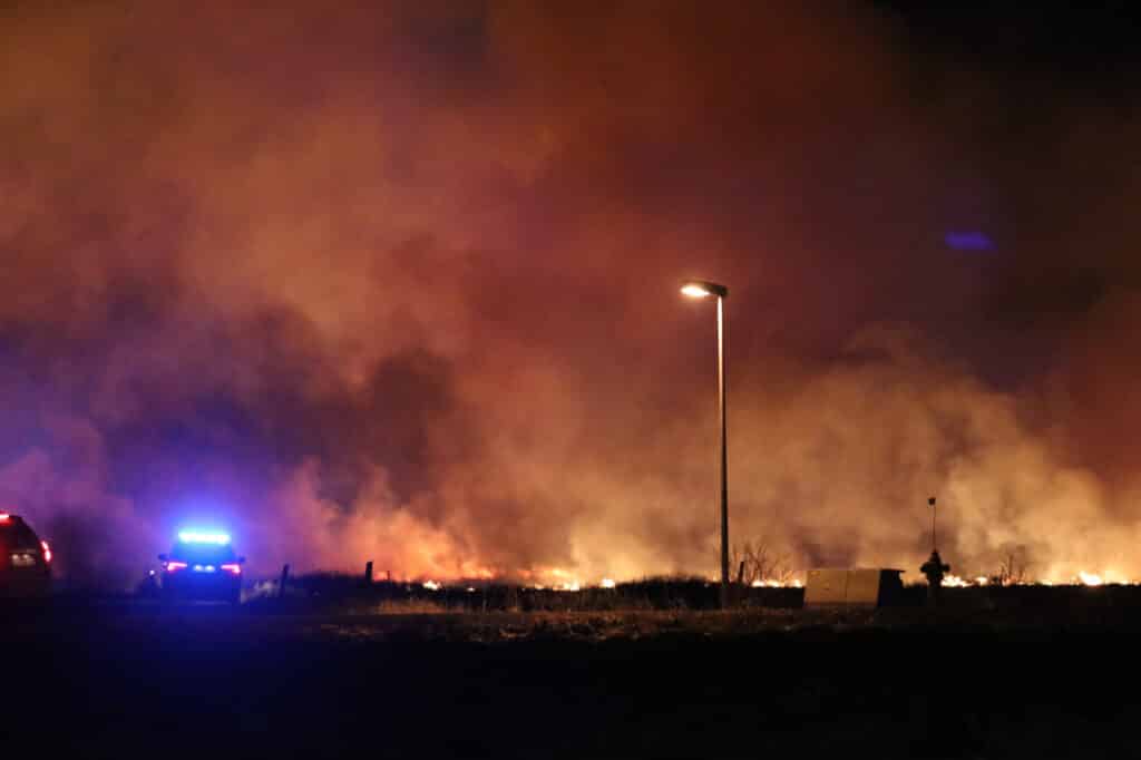 Þar logar mikill eldur á stóru svæði austarlega í byggðinni en að því er virðist stendur eldur og reykur að mestu leiti frá húsunum í hverfinu. Aðstæður eru erfiðar á vettvangi þar sem talsverður vindur er á staðnum sem eykur hratt á útbreiðslu eldsins.