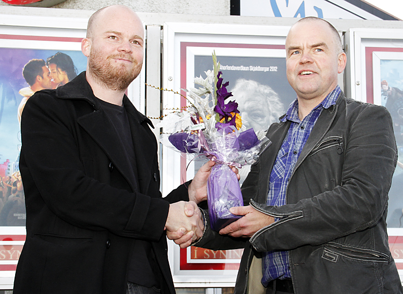 Kjartan Björnsson, formaður Menningarnefndar Árborgar, afhenti Grími Hákonarsyni, kvikmyndagerðarmanni frá Vorsabæ í Flóa, blómvönd við Selfossbíó í dag í tilefni af sýningu myndarinnar Hreint hjarta.