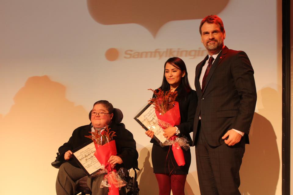 Árni Páll Árnason, formaður Samfylkingarinnar, veitti Selfyssingnum Guðjóni Reykdal Óskarssyni og Priyanka Thaba hvatningaverðlaun Samfylkingarinnar undir lok landsfundar Samfylkingarinnar í dag.