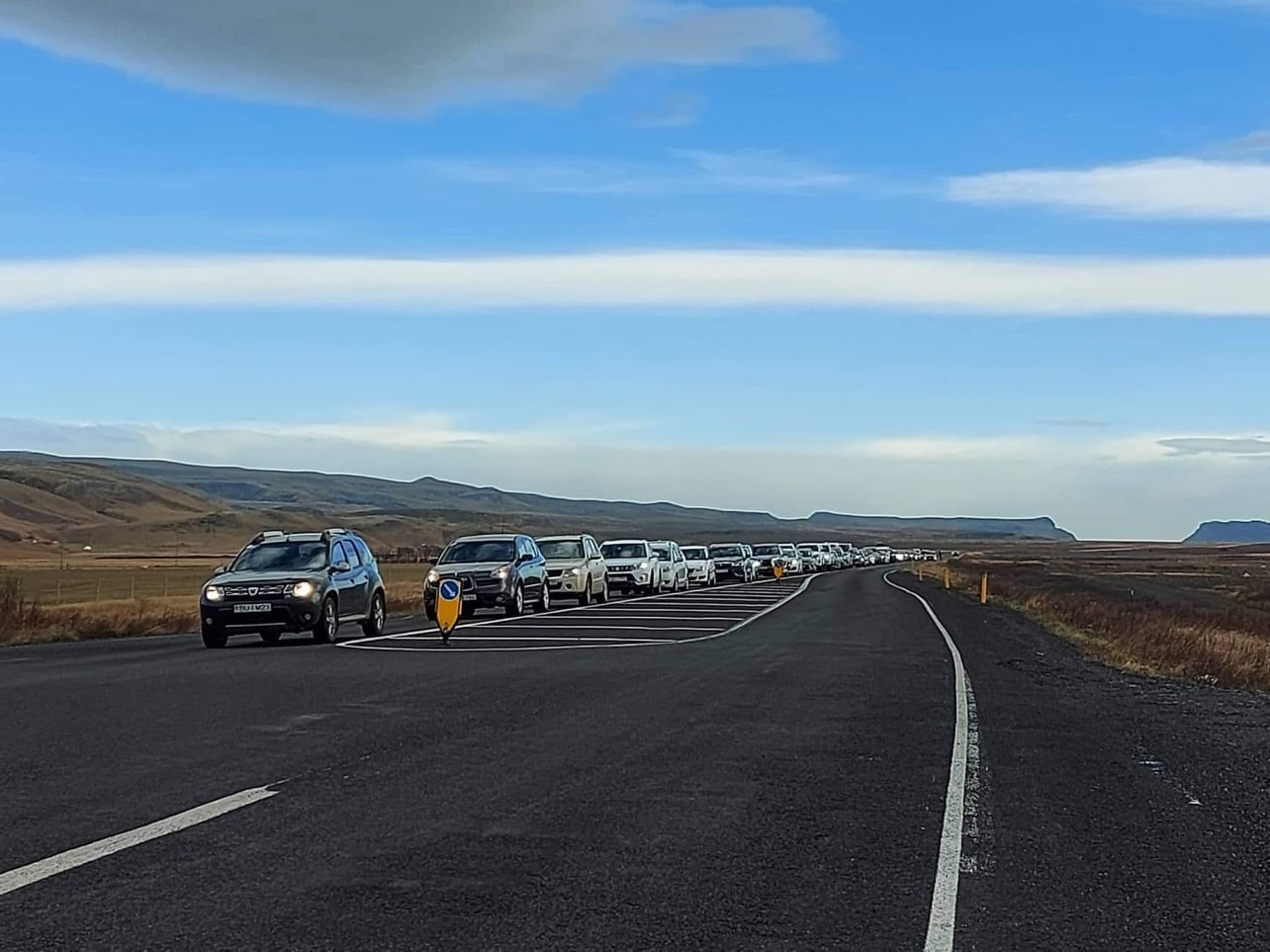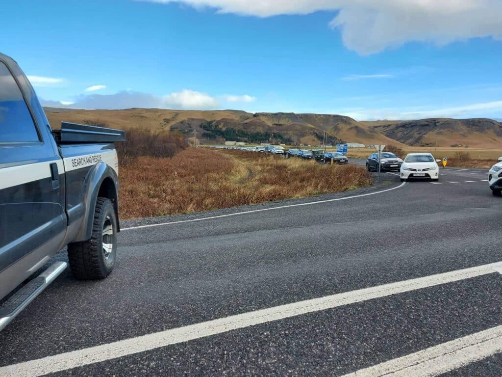 Mikill fjöldi bíla var a svæðinu og þurfti fólk að bíða af sér veðrið í Skógum áður en það gat haldið för sinni áfram.