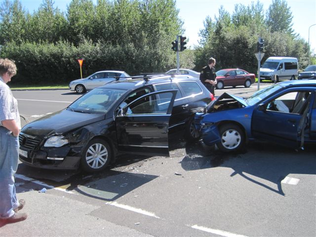 Bílarnir komu úr gagnstæðri átt inn á gatnamótin. Ökumaður annars bílsins hugðist beygja til vinstri inn á Engjaveg en ók þá inn í hlið hins bílsins.
