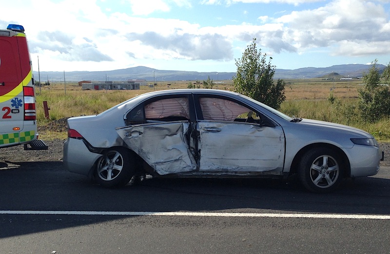 Áreksturinn var nokkuð harður en bíllinn var á leið suður Eyrarbakkaveg þegar ökumaðurinn missti hann út í kant og á ljósastaur. Bíllinn tókst á loft og snerist í hálfhring á veginum en hélst á réttri akrein.