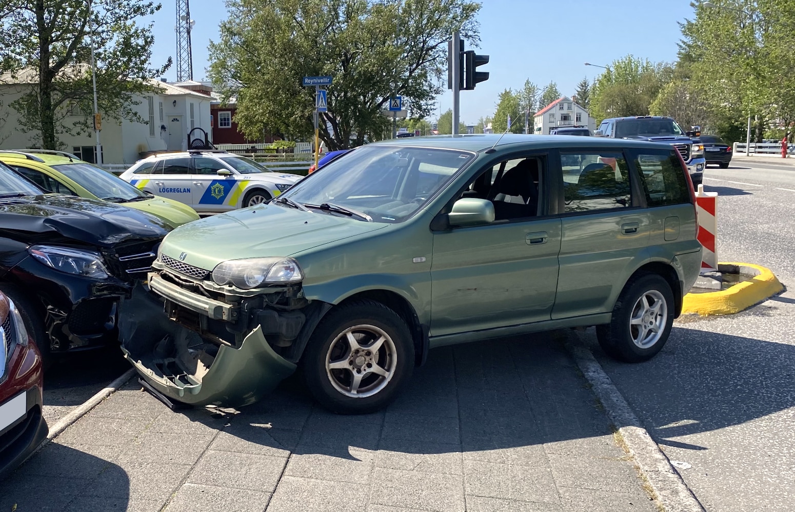 Þar fipaðist ökumanni sem beygði af Reynivöllunum inn á Austurveg. Hann ók á nýja umferðareyju við gangbraut á götuhorninu og kastaðist bíllinn upp á gangstétt og á bíl sem stóð kyrrstæður í bílastæði við Tölvulistann.