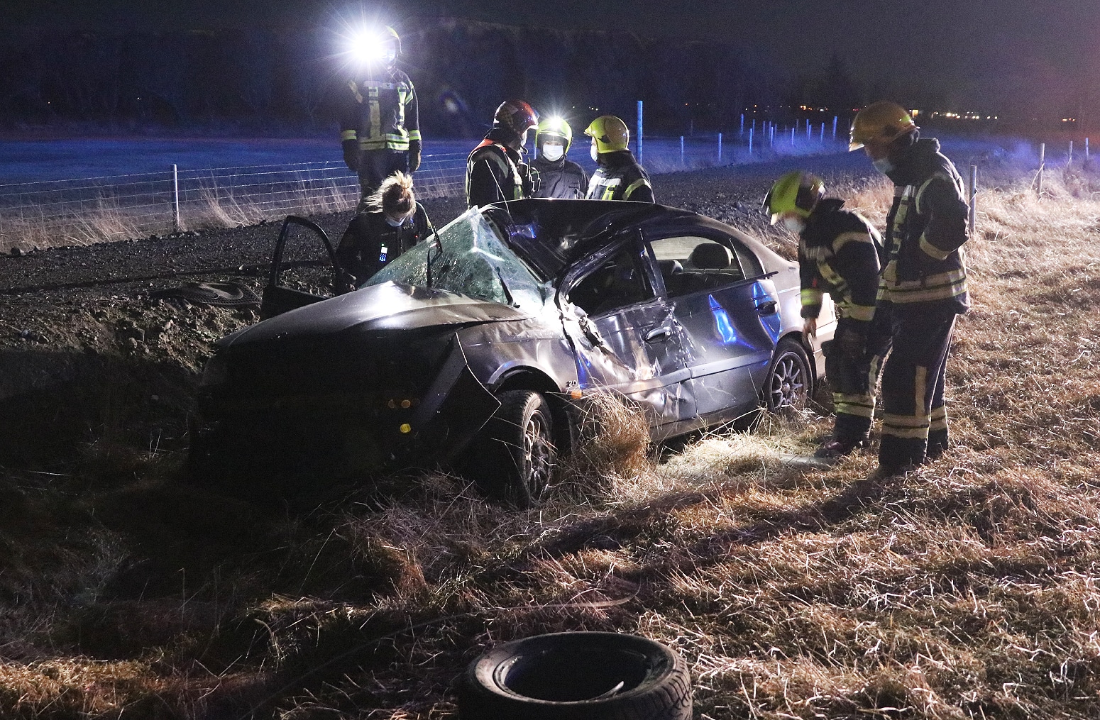 Fólksbíll á norðurleið fór útaf veginum vinstra megin í aflíðandi beygju við Stekka í Sandvíkurhreppi. Neyðarlínan fékk tilkynningu um slysið kl. 22:41 og var mikið viðbragð vegna þess.