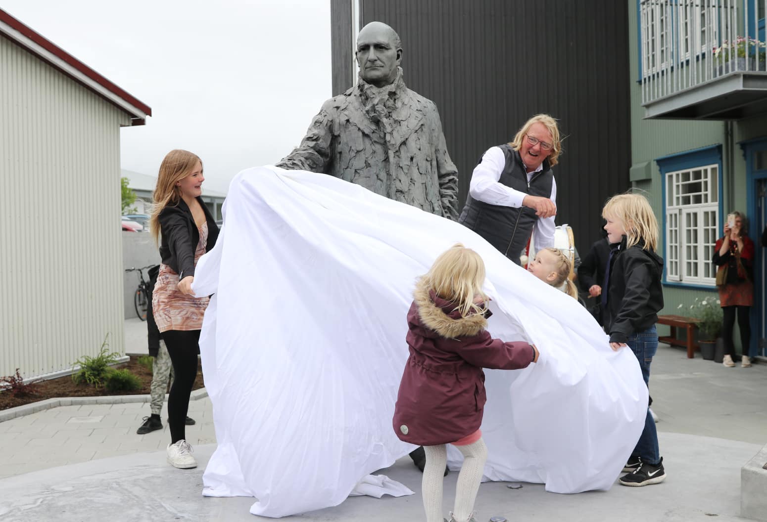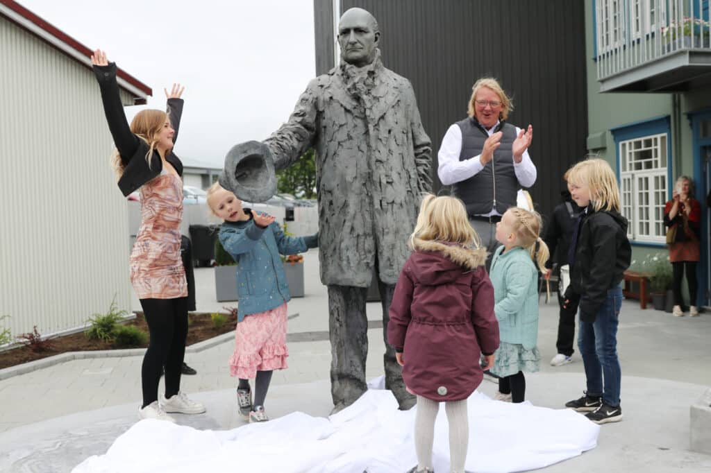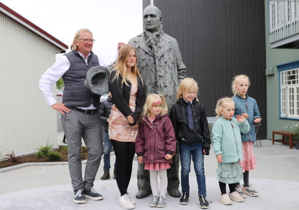 Það voru síðan barnabarnabarnabörn Egils, öll búsett á Selfossi, sem afhjúpuðu styttuna ásamt Grími Arnarsyni, langafabarni Egils.