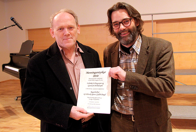 Friðrik Erlingsson, rithöfundur og Gunnar Þórðarson, tónlistarmaður, fengu tveggja milljóna króna styrk úr Menningarsjóði Suðurlands í gær vegna óperunnar „Ragnheiður“.
