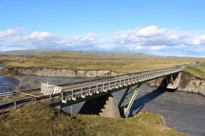 Rennsli við Sveinstind var um 600 m3/s kl. 9 og fór þá vaxandi. Búist er við að hámarksrennsli við þjóðveg 1 verði náð um 10 klukkustundum eftir að hámarki er náð við Sveinstind. Stærð hlaupsins ræðst af því úr hvorum katlinum hlaupið kemur.