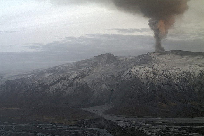 Gosmökkur stendur upp frá gígnum í Eyjafjallajökli til suðvesturs upp í 4 km hæð, gjóskufall er lítið og ekki hefur frést af öskufalli á láglendi.