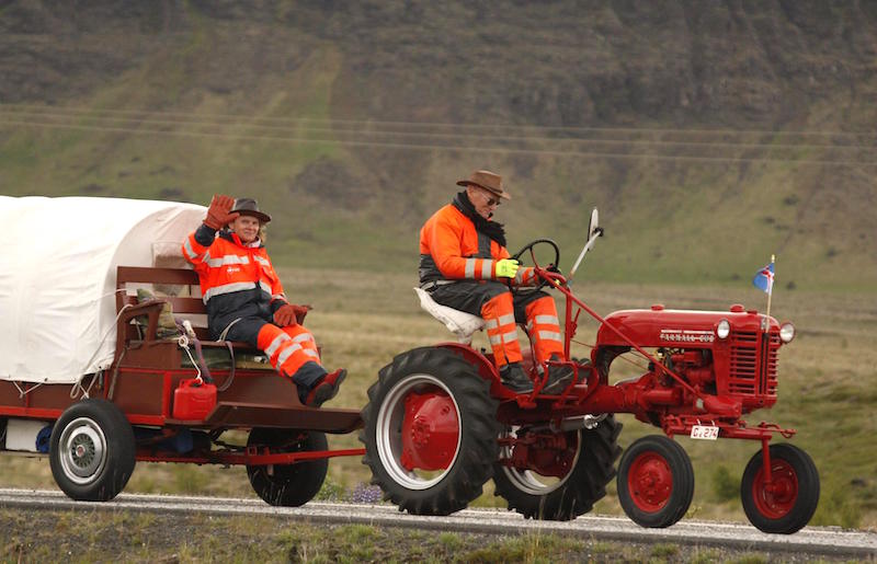 Þau fá mikil viðbrögð á vegunum, fólk vinkar þeim og hvetur þau áfram um leið og það dáist að frumkvæði þeirra og að nenna að standa í þessu. „Já, já, fólk stoppar mikið og spjallar við okkur. Margir taka ljósmyndir og aðrir vilja forvitnast um dráttarvélina og enn aðrir vilja fá að kíkja inn í kúrekakerruna,“ segir Júlía.