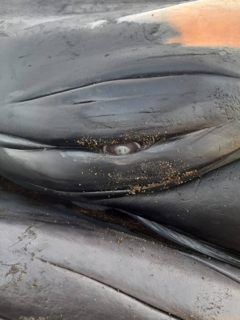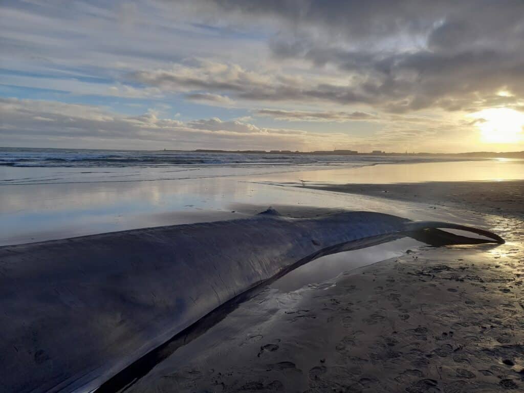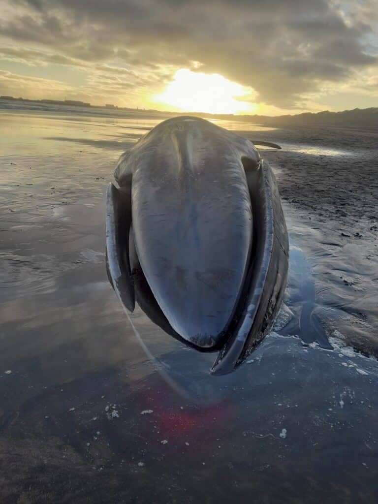 Hvalurinn fannst í morgun og telja fróðir menn að þarna sé sandreyður á ferðinni. Dýrið er sennilega nýdautt þar sem enn blæðir úr skolti þess. Það er um 14 metra langt en fullvaxin sandreyður verður 14-16 metra löng og vegur tuttugu tonn.