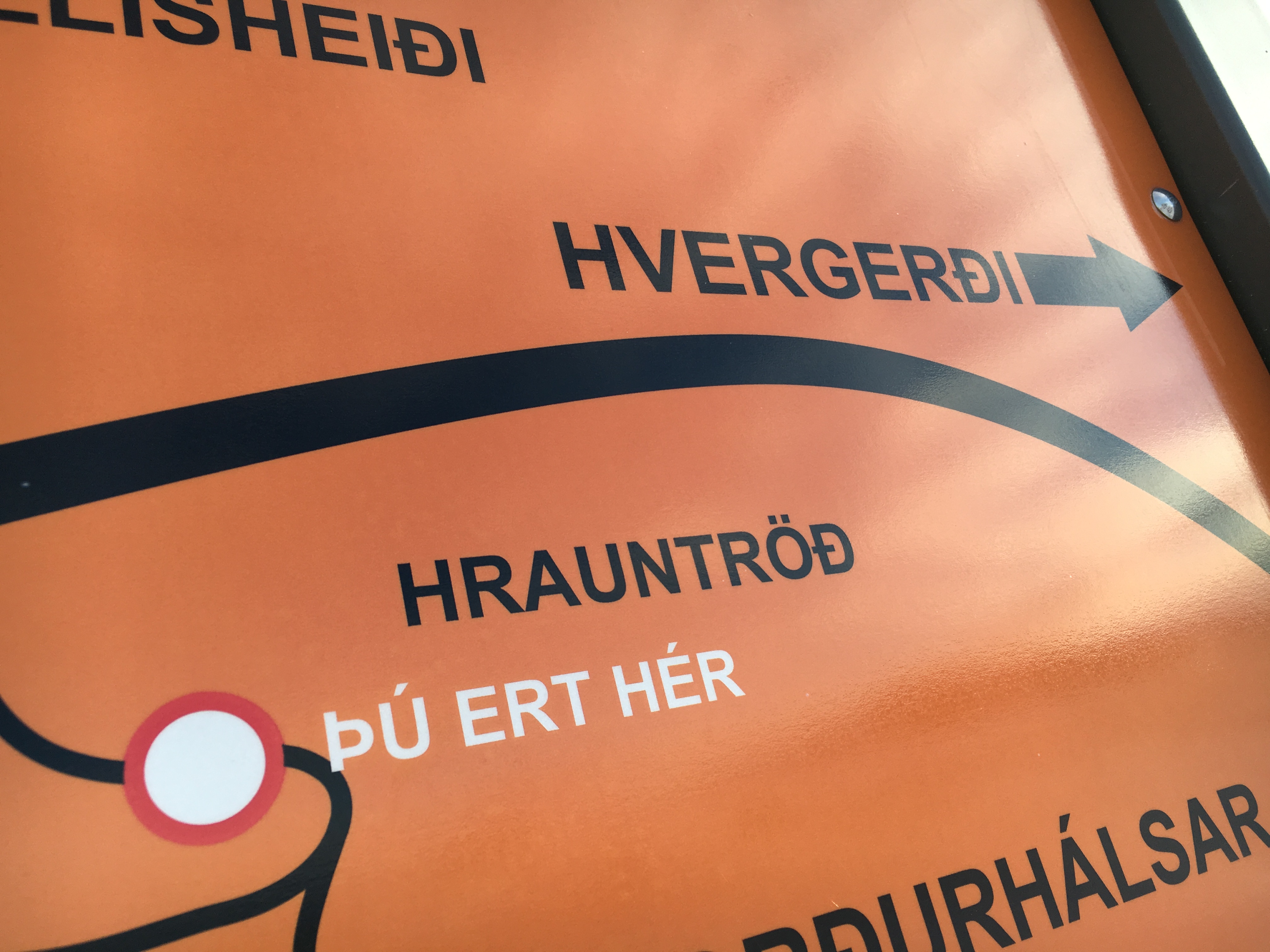 Blaðamaður sunnlenska.is átti leið um svæðið í gær og staldraði auðvitað við til þess að skoða nýja skiltið. Það voru reyndar ekki jarðhitalagnirnar sem vöktu mesta athygli, heldur meinleg stafsetningarvilla, sem vísar vegfarendum á HVERGERÐI.