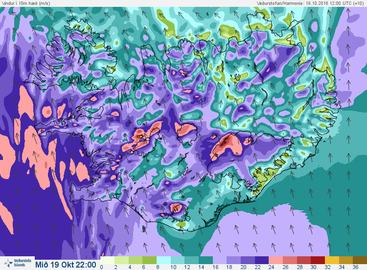 Í kvöld er útlit fyrir suðaustan og síðan sunnan 20-30 m/s, hvassast til fjalla og einnig er búist við snörpum vindhviðum við fjöll, jafnvel yfir 40 m/s. Talsvert hægari vindur og þurrt austanlands.