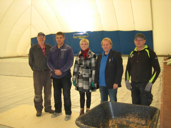 Það er fyrirtækið Sporttæki í Hveragerði sem var lægstbjóðandi í bæði gervigras og gólfið og er hópur manna frá þeim nú að störfum í höllinni svo allt gangi nú hratt og vel fyrir sig.