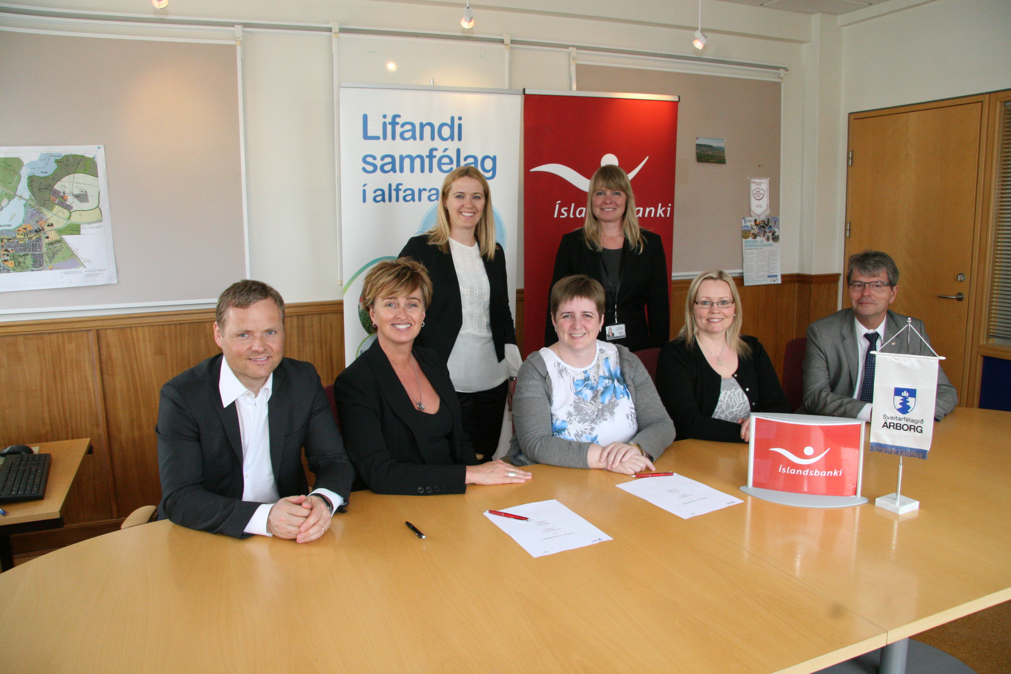 Á myndinni hér fyrir ofan eru (fremst f.v.) Vilhelm Már Þorsteinsson, framkvæmdastjóri fyrirtækjasviðs Íslandsbanka, Una Steinsdóttir, framkvæmdastjóri viðskiptabankasviðs Íslandsbanka, Ásta Stefánsdóttir framkvæmdastjóri Sveitarfélagsins Árborgar, Ingibjörg Garðarsdóttir fjármálastjóri Árborgar og Jón Rúnar Bjarnason, útibússtjóri Íslandsbanka á Selfossi. (Fyrir aftan f.v.) Rósa Júlía Steinþórsdóttir, fyrirtækjasviði Íslandsbanka og Sigurveig Sigurðardóttir viðskiptastjóri fyrirtækja hjá Íslandsbanka á Selfossi.