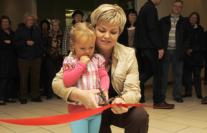 Eftir ræðuhöld og formlegheit klipptu Aldís Hafsteinsdóttir, bæjarstjóri, og Rut Þorsteinsdóttir, frá Kotströnd í Ölfusi, á borða og opnuðu sýninguna. Rut, sem var sex mánaða gömul þegar skjálftinn reið yfir, bjargaðist úr skjálftanum án þess að fá skrámu eftir að stór skápur féll yfir hana þar sem hún lék sér á stofugólfinu heima hjá sér. Saga hennar er m.a. rifjuð upp á sýningunni.
