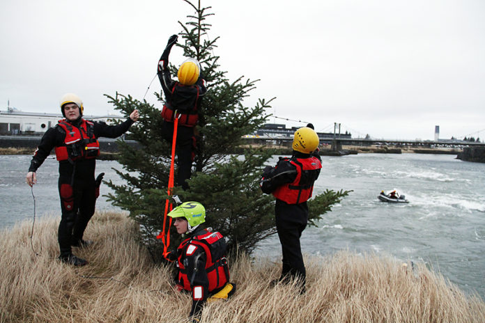 Eftir að hafa sett upp seríuna og tengt hana rafgeymi notaði björgunarfélagsfólkið ferðina til æfingar á straumvatnsbjörgun í ánni.