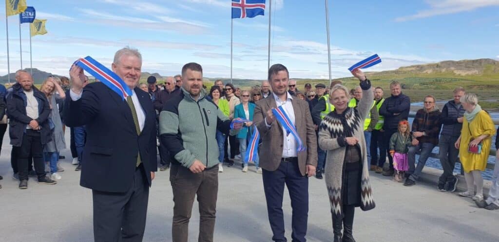 Ný tvíbreið brú yfir Stóru-Laxá í Hreppum var opnuð formlega í dag. Sigurður Ingi Jóhannsson, innviðaráðherra og Bergþóra Þorkelsdóttir, forstjóri Vegagerðarinnar héldu stuttar ræður á brúnni áður en þau klipptu á borða til að marka hina formlegu opnun.