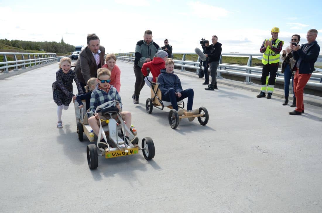 Hefð hefur verið fyrir því að ráðherra fari fyrstur yfir brýr eftir formlega opnun en í þetta sinn voru það börn af svæðinu sem fengu þann heiður en fararskjótarnir voru forláta kassabílar sem þeir Haraldur og Jón ýttu yfir brúna.
