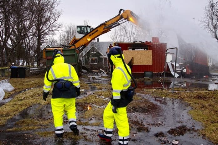 Brunavarnir Árnessýslu eru með bíl á staðnum og er vatni sprautað yfir rústirnar til þess að rykbinda en sérstakrar varúðar er gætt við niðurrifið til þess að koma í veg fyrir asbestmengun.